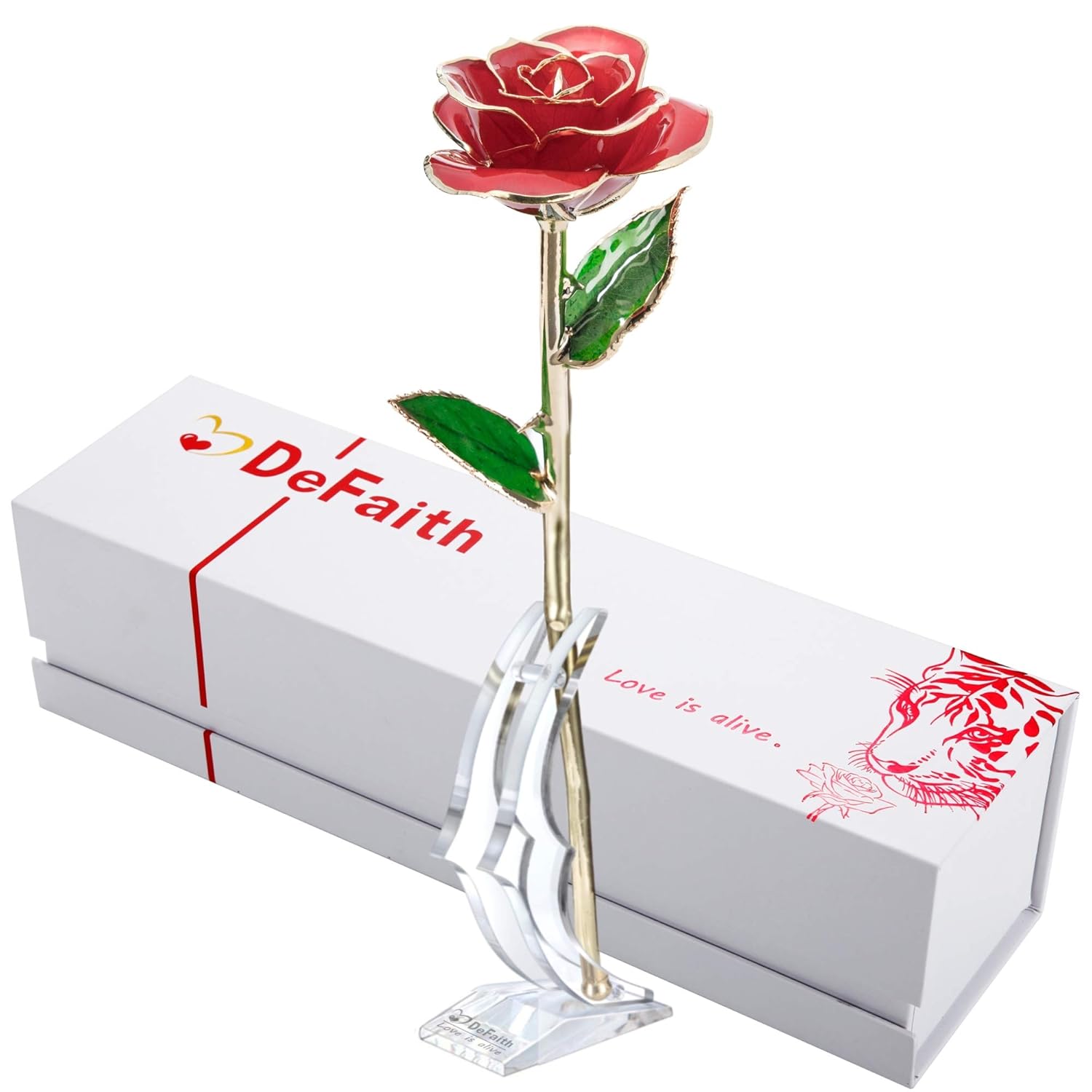【High Quality Guarantee by DeFaith Brand】 - DeFaith produce NOTHING but REAL rose gifts for your loved one. This 24k Gold Dipped Real Rose comes with Moon-shape Stand, Authorized Certificate Card and Greeting Card.